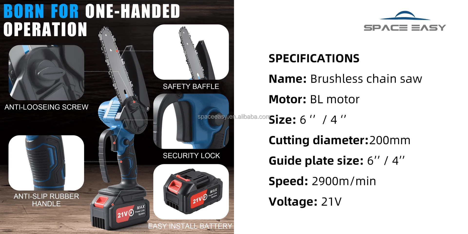 This is a DC brushless motor electric chain saw independently developed by SPACE EASY, which can be equipped with 6-inch or 4-inch chains and guide plates. At the same time, it has a safety protection switch, ensuring reliable and safe use. It has a maximum cutting diameter of 200mm and a speed of up to 2900 revolutions per minute, making it suitable for household use, garden care, and other scenarios.
