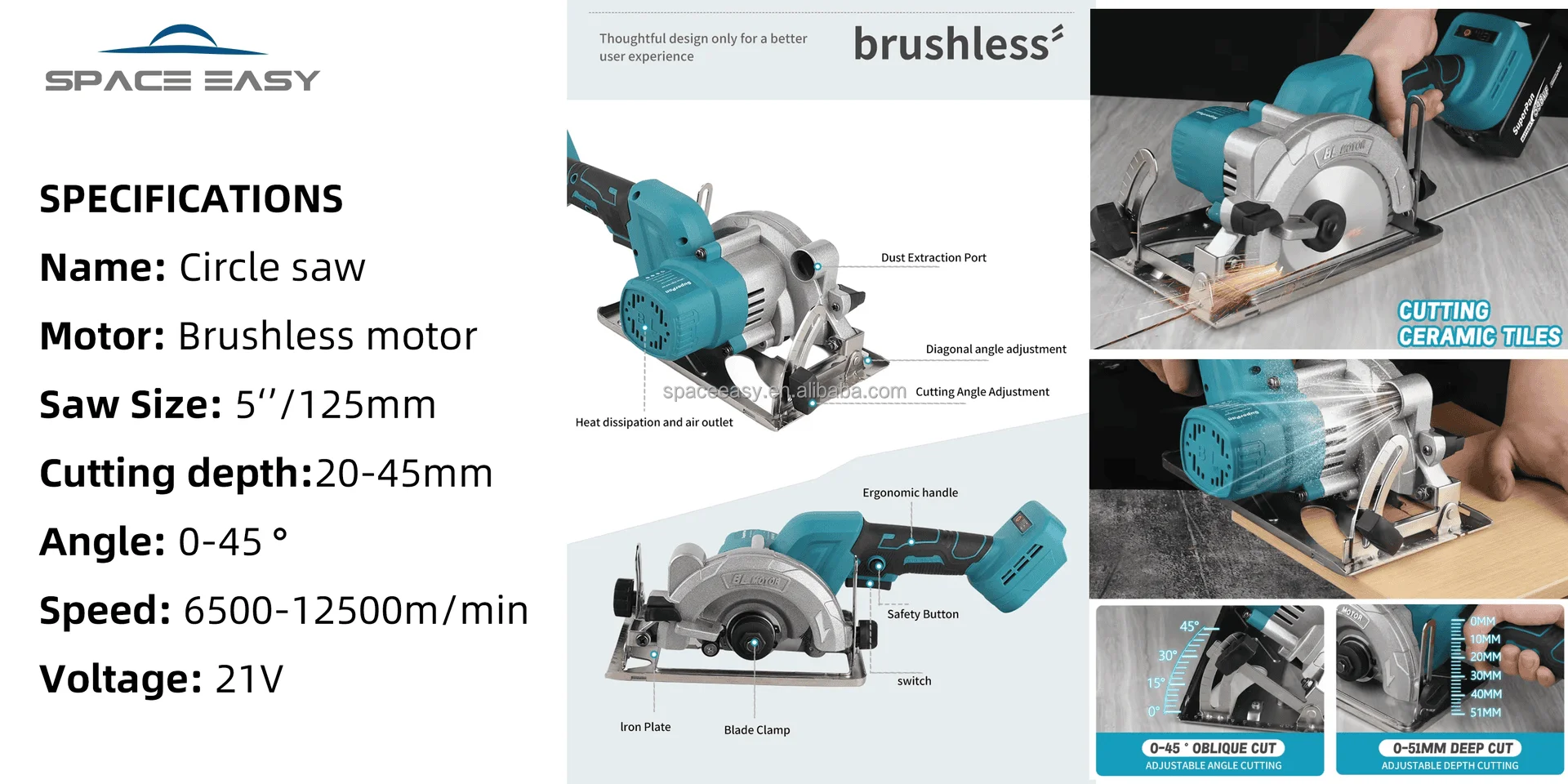 This is a 5-inch 125mm hand pushed circular saw driven by 10 cells 21V lithium batteries. It is equipped with a high-speed and high torque DC brushless motor drive, with a cutting depth of up to 45mm and a cutting angle that can be adjusted to 45 degrees. The speed can reach 10000-12500 revolutions per minute and is suitable for applications such as sheet metal, wood, and bricks.