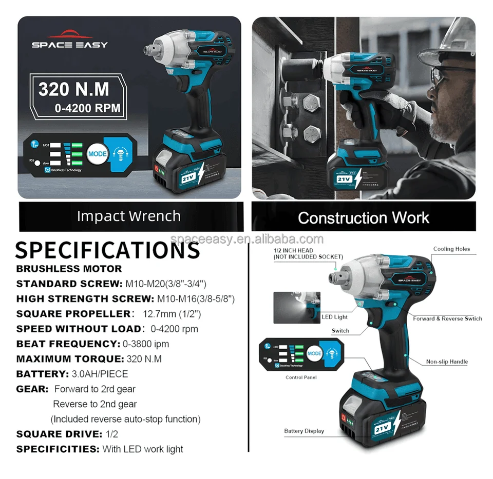 Powered by a 21V ternary power battery, the battery can be optionally equipped with 2-4AH. High quality brushless motor that can provide up to 320N. M torque. It has full power and is suitable for household use, professional tools, maintenance and other application scenarios.